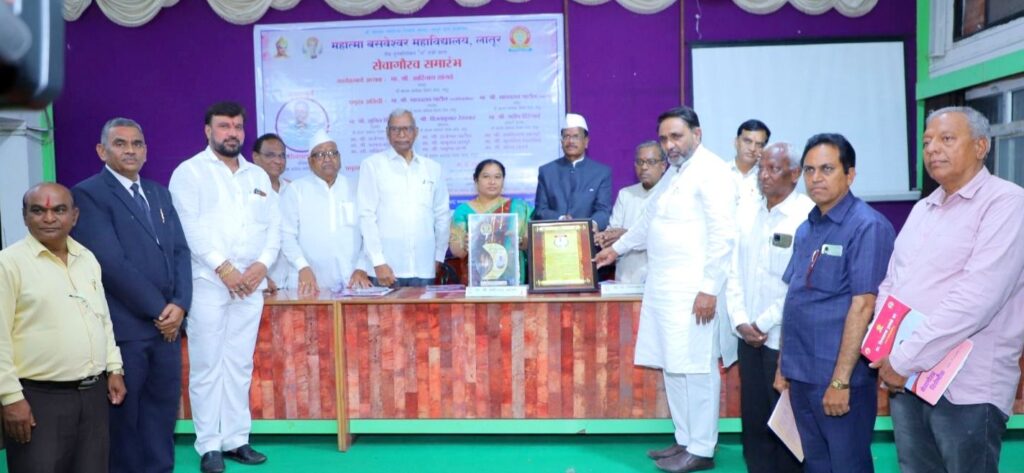 लातूर : श्री महात्मा बसवेश्वर शिक्षण संस्था, लातूर द्वारा संचलित महात्मा बसवेश्वर महाविद्यालयात पर्यवेक्षक प्रा. शिवशरण हावळे यांचा सहपरिवार स्मृतिचिन्ह, सन्मानपत्र आणि आहेर देऊन अध्यक्ष आदिनाथ सांगवे यांच्या हस्ते सत्कार करण्यात आला